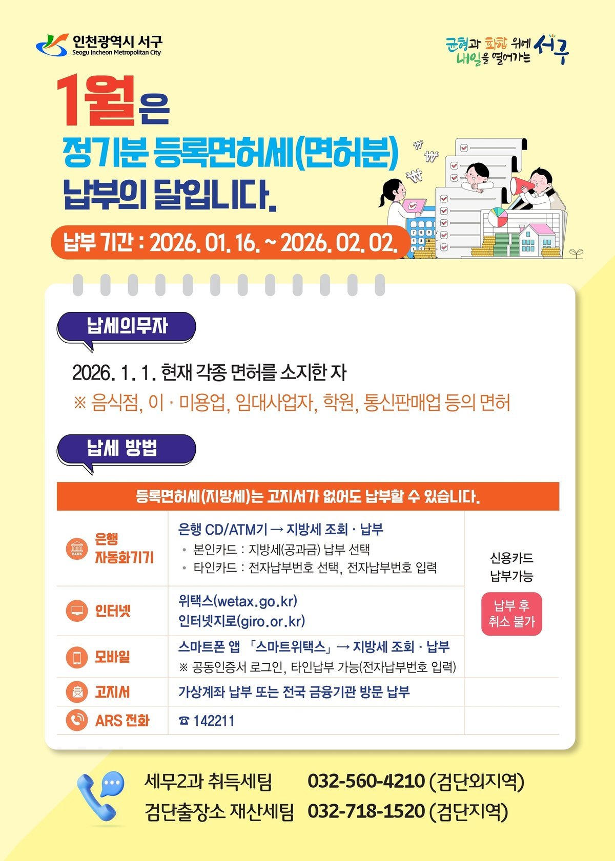 [금요저널] 인천 서구는 2026년도 1월 정기분 등록면허세 8만5천여 건, 28억9천4백만 원을 부과하고 올해 2월 2일까지 납부를 당부하는 등 적극적인 홍보에 나섰다.
