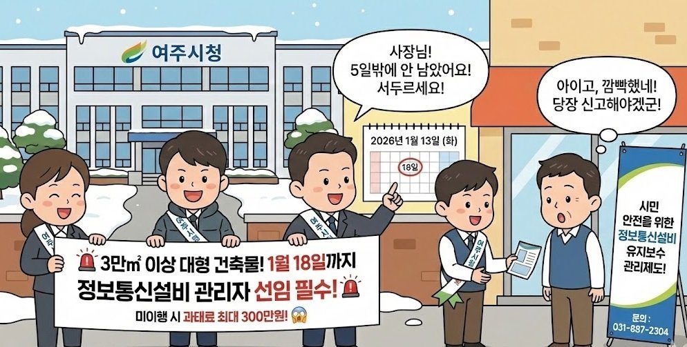 ### 3만㎡ 이상 건축물, 유예기간 종료 임박. 현재 여주시 내 연면적 3만㎡ 이상인 대형 건축물의 관리주체는 오는 2026년 1월 18일까지 정보통신설비 유지보수 관리자를 선임하고 지자체에 신고를 완료해야 합니다.