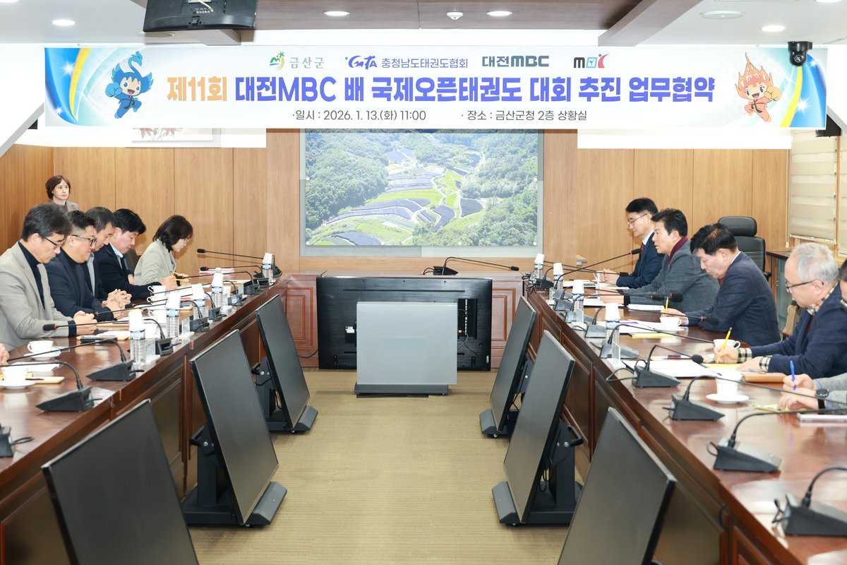 [금요저널] 금산군은 지난 13일 군청 2층 상황실에서 제11회 대전엠비씨배 국제오픈태권도대회 유치를 위해 대전엠비씨, 충남태권도협회, 엠비씨국제오픈태권도조직위원회와 업무협약을 체결했다.
