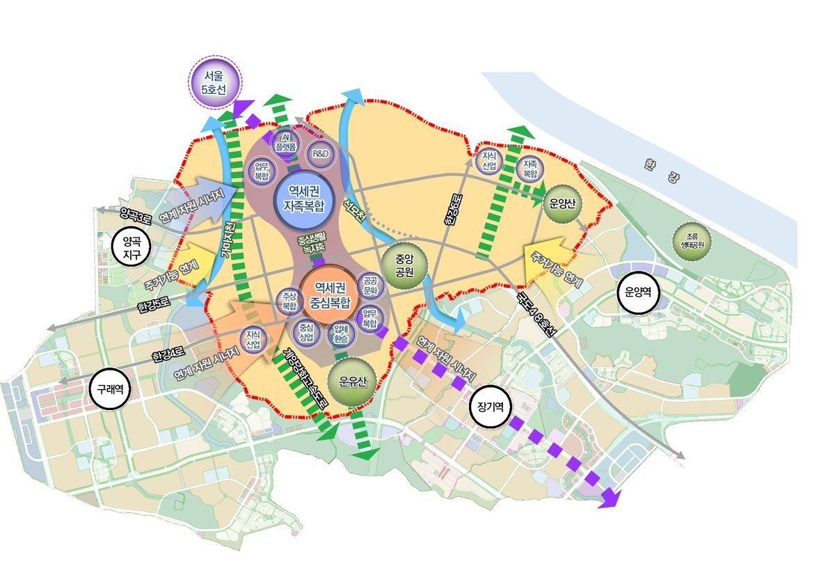 ‘역세권 콤팩트시티’ 개념을 적용해 지구 내 전철역 주변을 중심으로 고밀·압축 개발을 추진하며, 기존 김포한강신도시와의 연계 개발을 통해 통합 신도시 체계를 구축한다는 점이 변별점이다. 두 신도시를 합산할 경우 전체 면적은 1,817만㎡, 총 가구수는 12만 1천 가구 규모로 분당급 신도시 수준의 도시가 완성될 전망이다.
