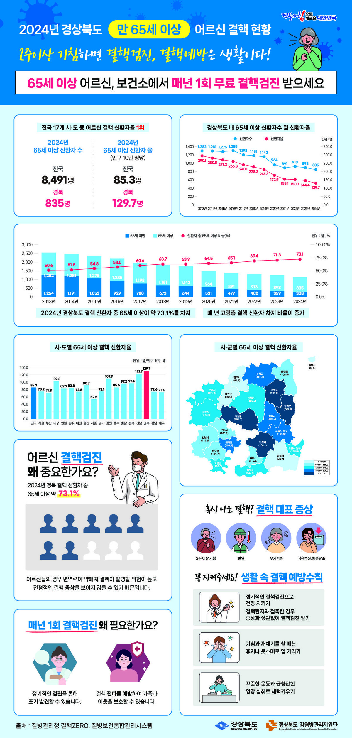 특히 2024년 결핵환자 신고 건 중 65세 이상의 환자 비율은 약 59%를 차지해 65세 이상의 어르신들을 중심으로 각별한 주의와 관심이 필요하다.