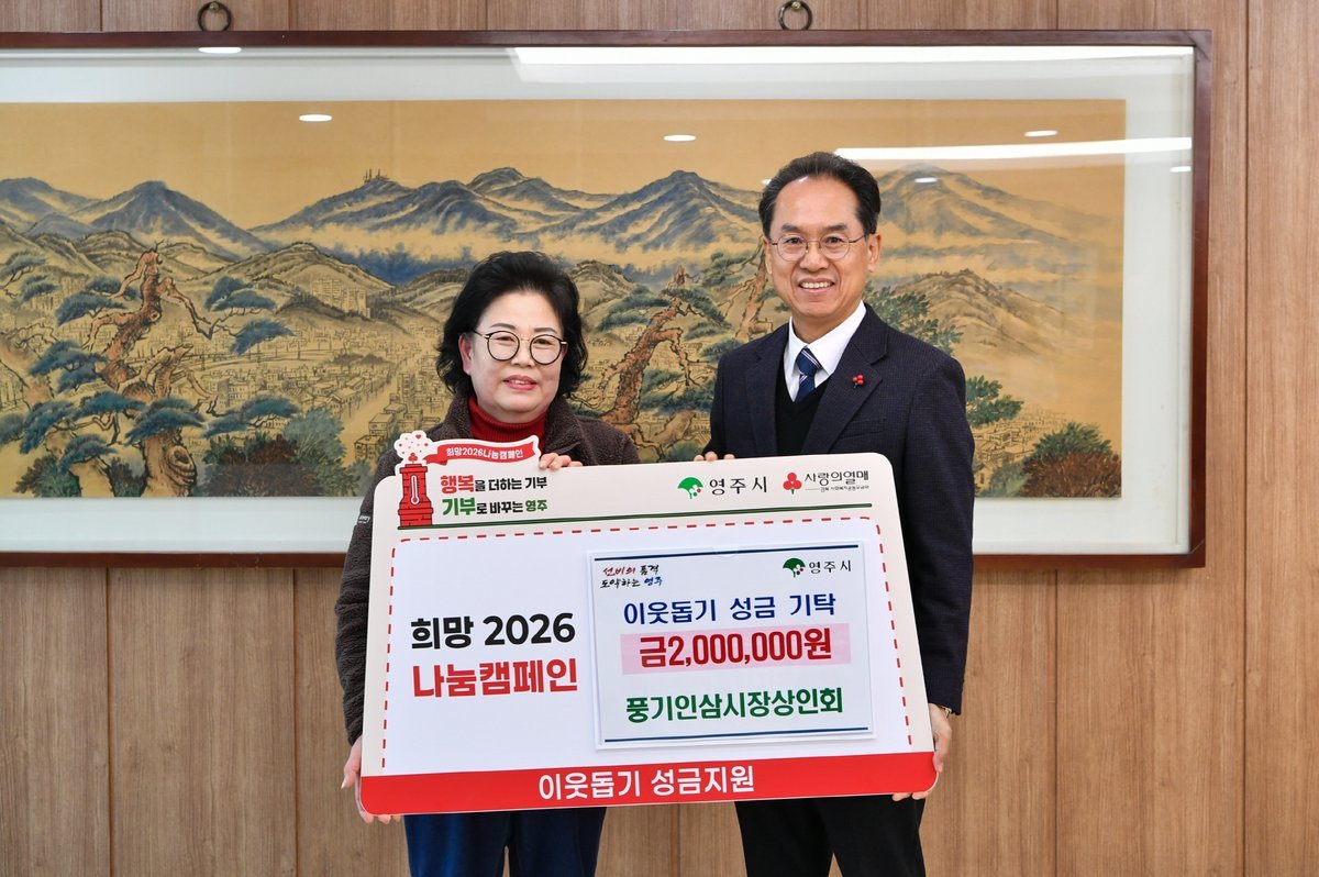 [금요저널] 영주시는 지난 14일, 풍기인삼시장상인회가 영주시청을 방문해 희망2026 나눔캠페인 이웃돕기 성금 200만 원을 기탁했다고 밝혔다.