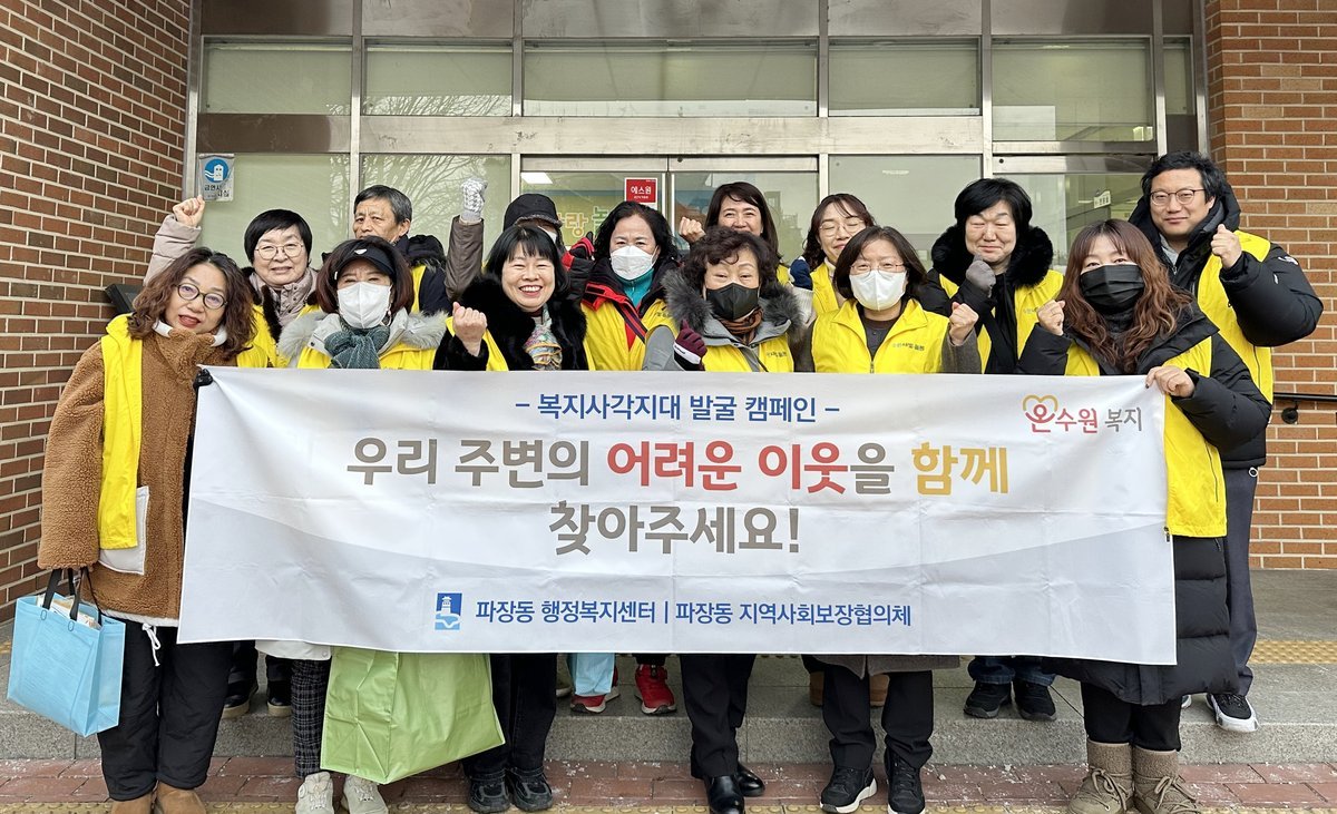 장인영 파장동장은 “이번 캠페인을 통해 지역 내 복지사각지대 대상자를 발굴하고 주민과 함께 복지 안전망를 강화하는 계기가 됐다 ”며 “앞으로도 현장 중심의 복지사각지대 발굴 활동을 지속적으로 추진하겠다 ”고 말했다.