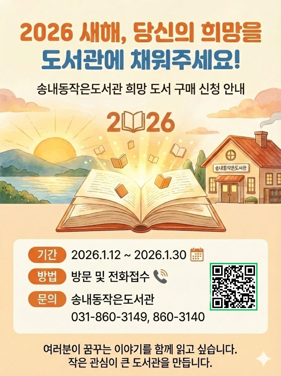 희망도서 접수 기간은 2026년 1월 12일부터 1월 30일까지이며, 송내동 주민이라면 누구나 신청할 수 있다.