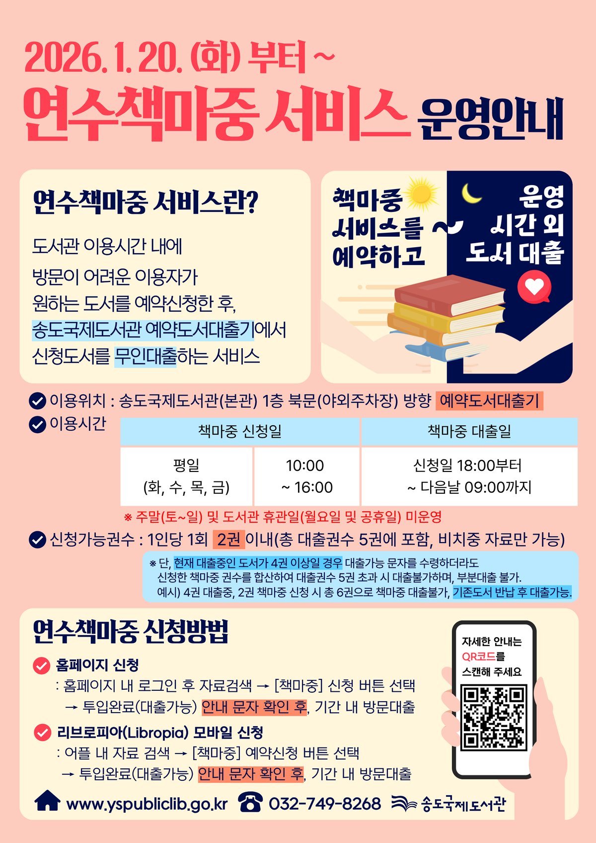 ‘연수책마중 서비스’는 송도국제도서관 1층 북문 방향에 설치된 예약도서 대출기기를 통해 제공되며, 이용자는 1인당 1회 최대 2권까지 신청할 수 있다.