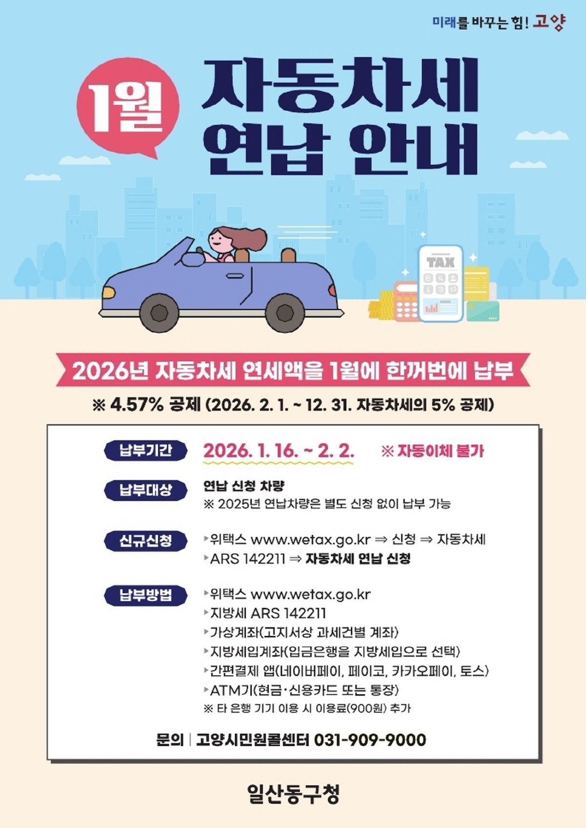 [금요저널] 고양특례시 일산서구는 지방세를 조기에 확보하고 납세자의 세금 부담을 완화하기 위해 2026년 자동차세 연납 신청기간을 1월 16일부터 2월 2일까지 운영한다고 밝혔다.