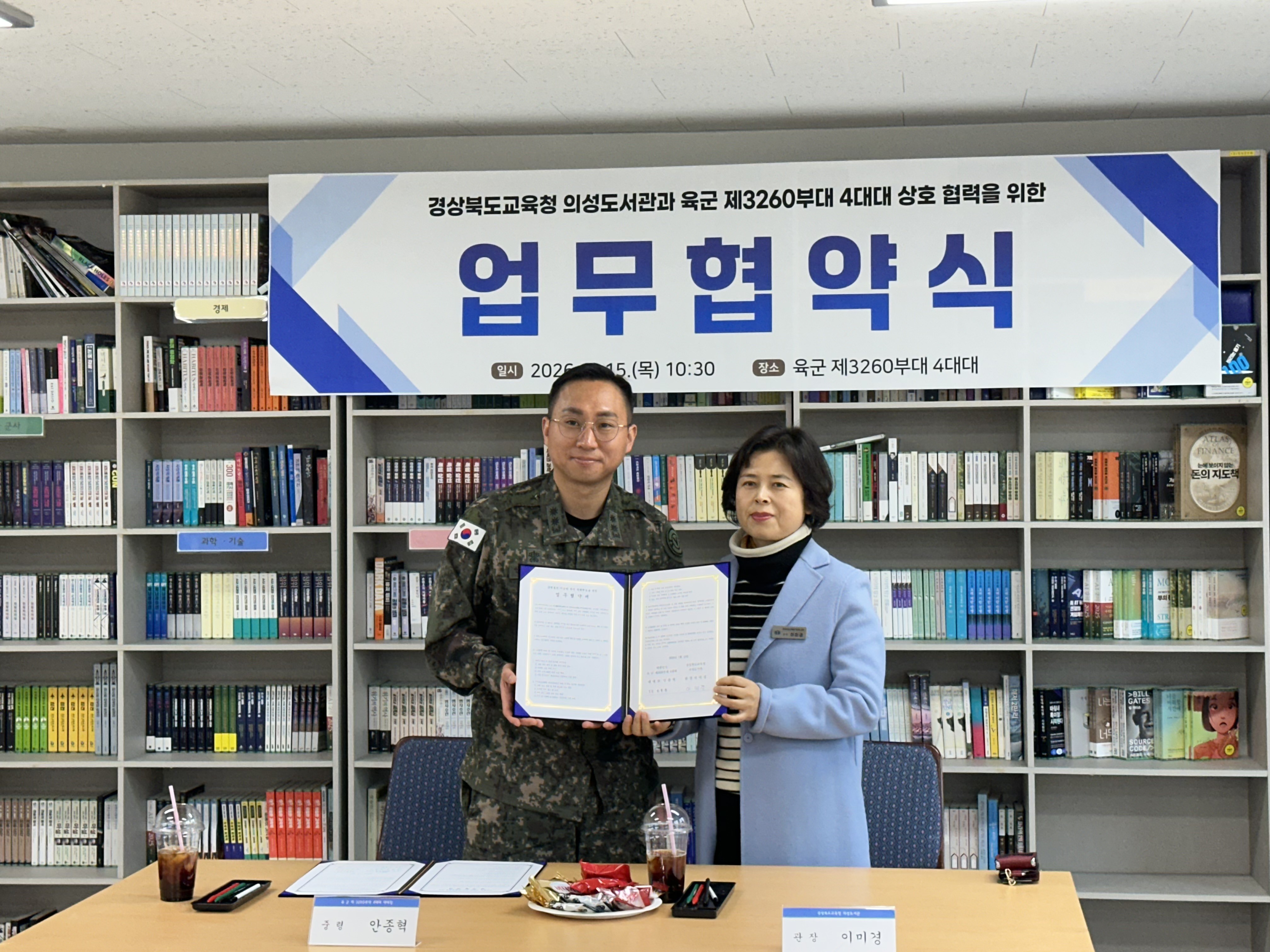 □ 경상북도교육청 의성도서관(관장 이미경)은 1월 15일(목) 육군 제3260부대 4대대, 의성군 가족센터와 각각 지역 독서문화 활성화를 위한 업무협약식을 체결했다고 밝혔다.