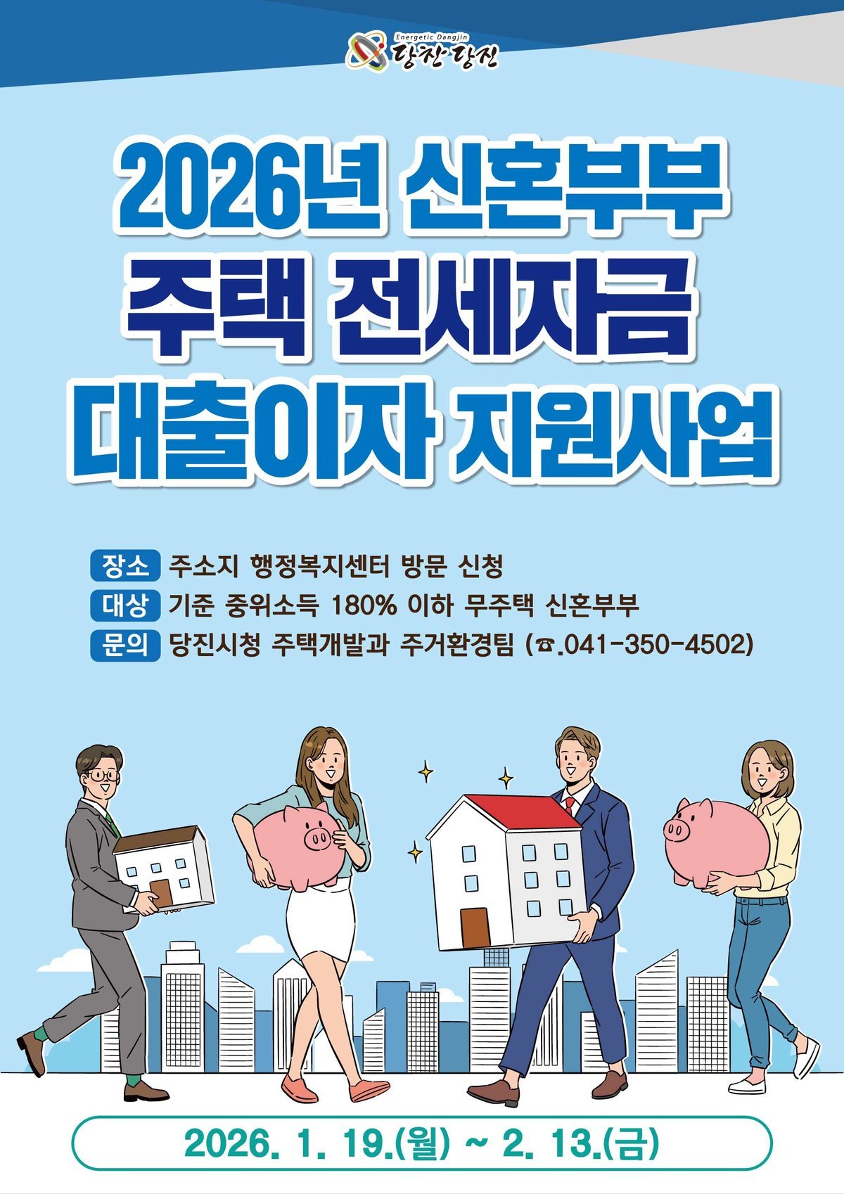 [금요저널] 당진시는 1월 19일부터 2월 13일까지 ‘2026년 신혼부부 주택 전세자금 대출이자 지원사업’신청자를 모집한다고 16일 밝혔다.