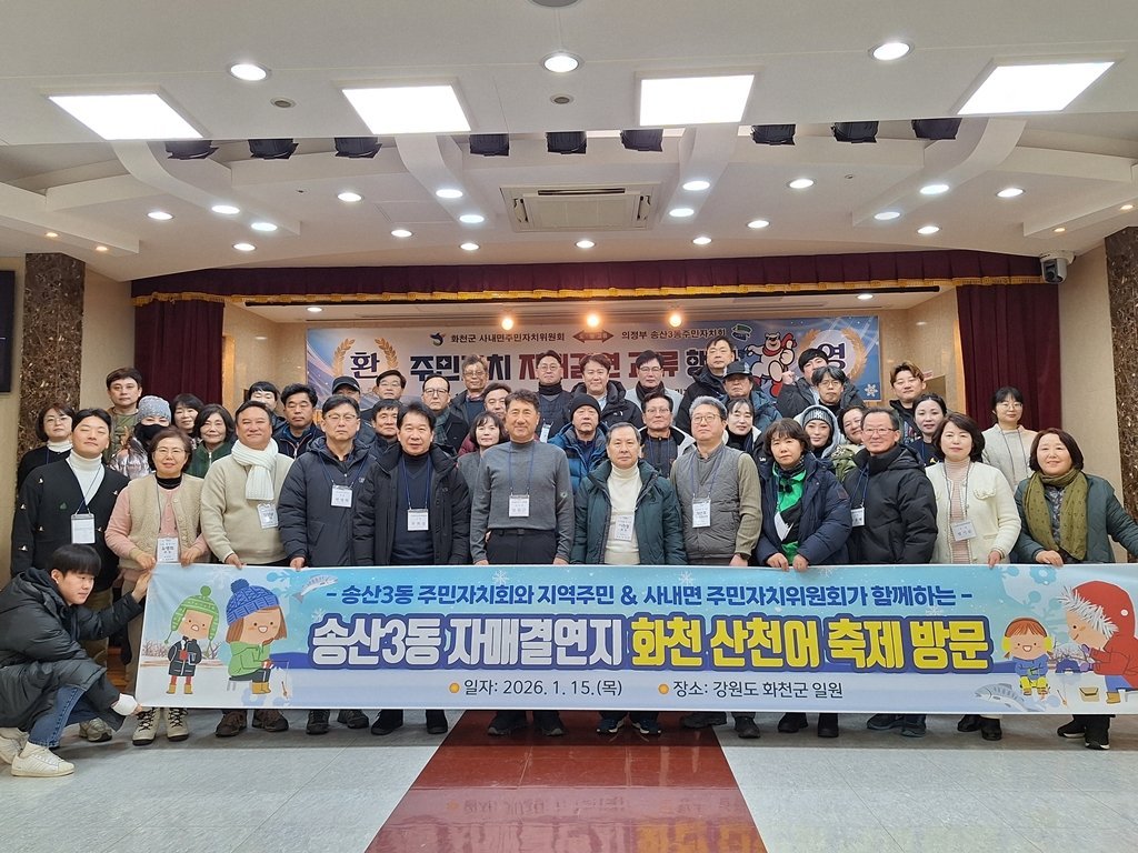 [금요저널] 의정부시 송산3동행정복지센터는 1월 15일 송산3동 주민자치회가 자매결연지인 강원특별자치도 화천군 사내면을 방문해 ‘2026 얼음나라 화천 산천어축제’의 성공적인 개최를 응원하고, 두 지역 간의 우호를 증진하는 시간을 가졌다고 밝혔다.