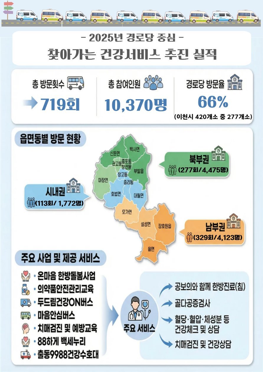 이천시보건소 관계자는 “경로당 중심의 실적 데이터를 분석해 보니 어르신들에게 더 효과적으로 다가갈 방법이 보였다”며 “2026년에는 이 데이터를 바탕으로 시민 곁으로 한 걸음 더 다가가 촘촘한 보건 서비스를 실현하겠다”고 밝혔다.