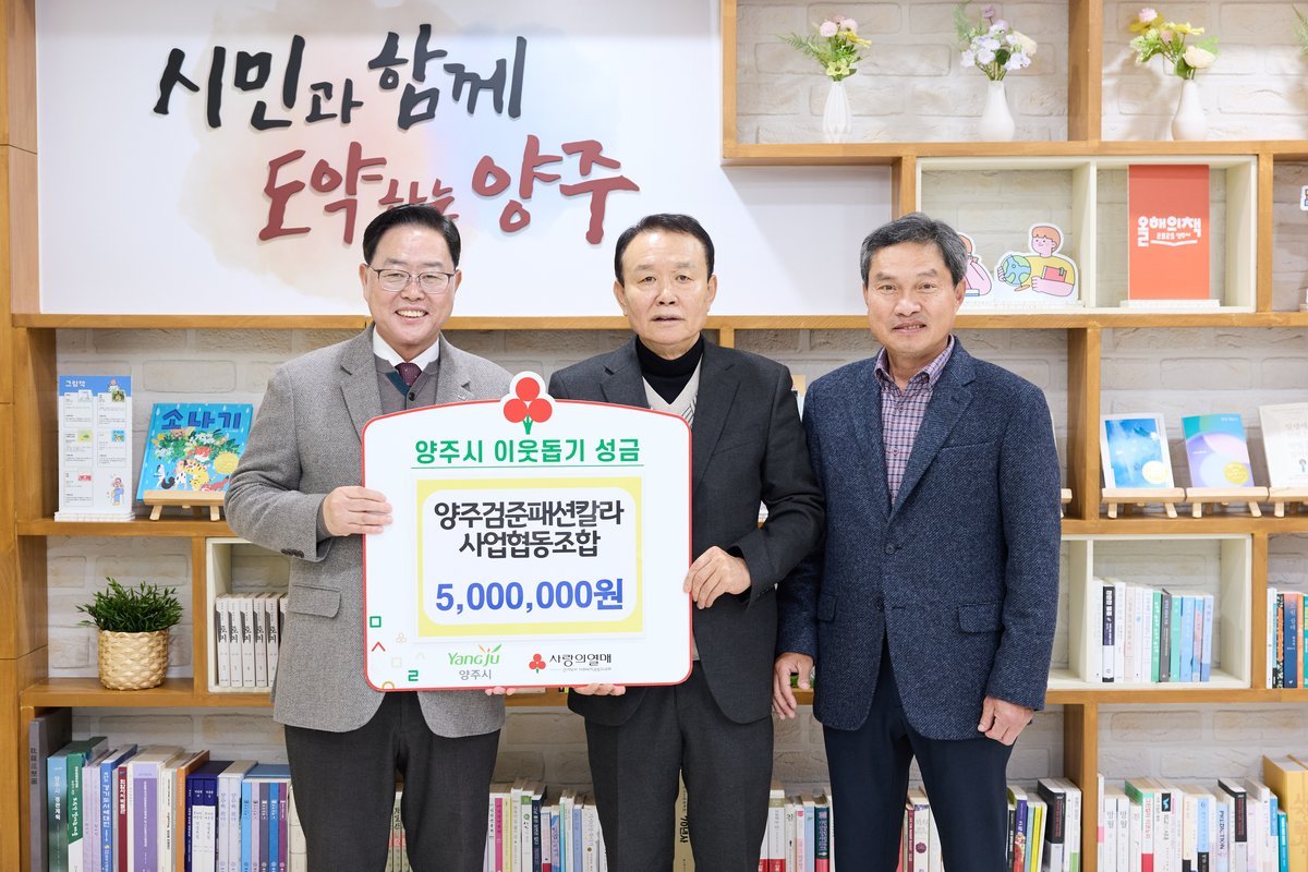 [금요저널] 양주시가 지난 15일 시장실에서 양주검준패션칼라사업협동조합을 비롯한 관련 단체 및 기업으로부터 이웃돕기 성금과 성품을 기탁받았다고 밝혔다.