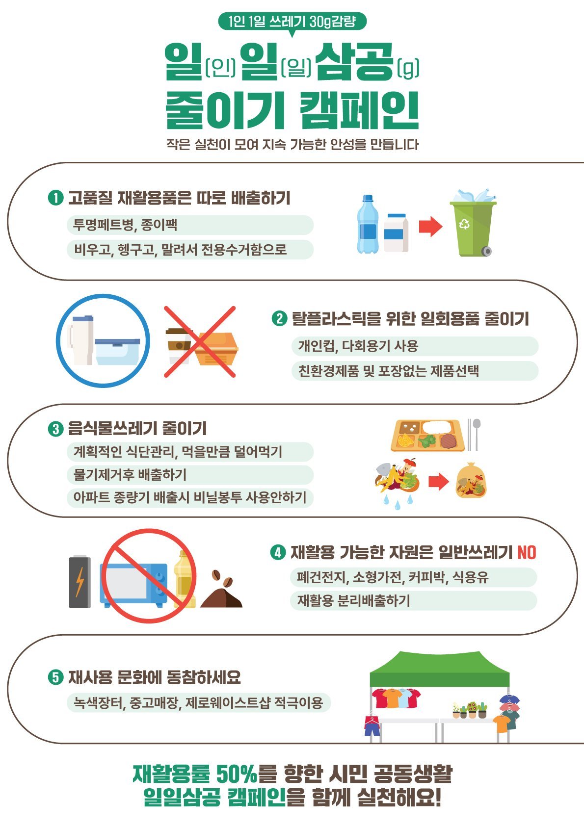 이에 시는 재활용률 50% 달성을 목표로 시민이 하루에 배출하는 쓰레기를 30그램씩 줄이는 생활 속 실천운동을 전개하고 있다.