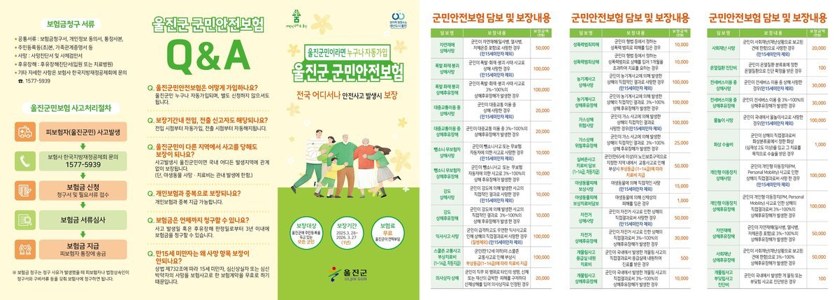 울진군 관계자는 “군민의 생명과 안전을 지키는 일은 행정의 가장 중요한 책무”며“군민안전보험이 각종 재난과 사고로부터 군민을 보호하는 실질적인 안전망으로 자리 잡을 수 있도록 지속적으로 운영해 나가겠다”고 말했다.