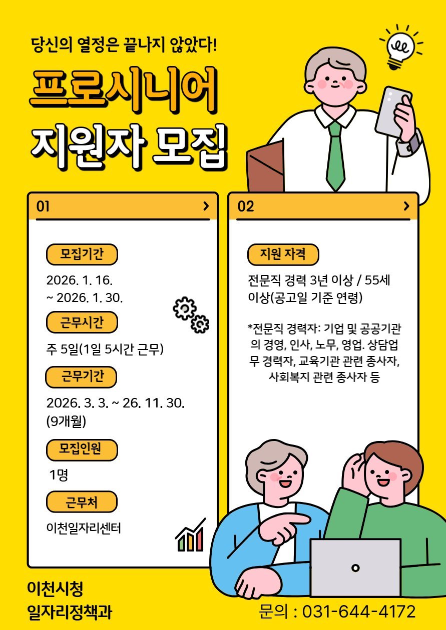 이천시 관계자는 “이번 프로시니어 모집은 경험 많은 중장년 인력이 지역 일자리 정책의 중요한 연결고리 역할을 하게 될 것”이라며 “전문성과 책임감을 갖춘 분들의 많은 관심과 참여를 바란다”고 말했다.