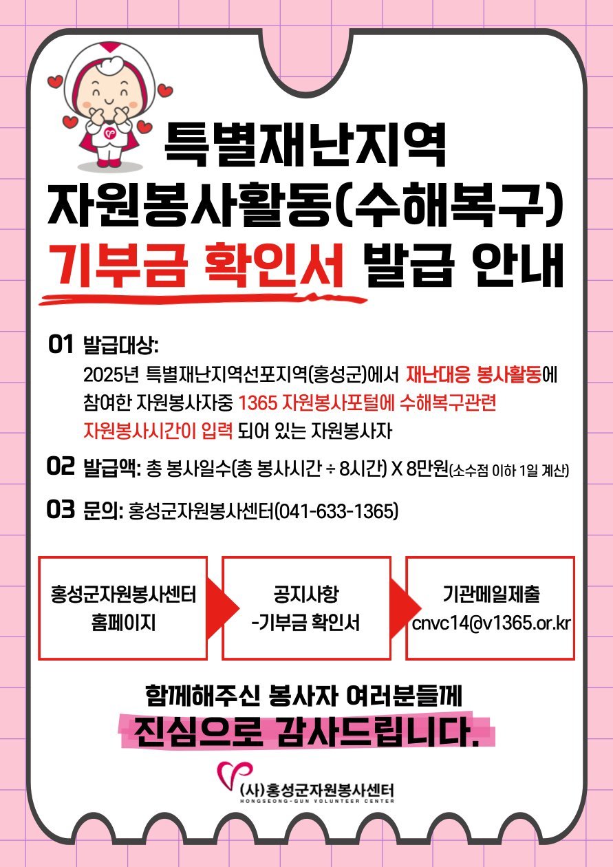 방은희 홍성군자원봉사센터장은 “이번 기부금 확인서 발급을 통해 재난 현장에서 헌신해주신 자원봉사자분들의 노고가 실질적으로 인정받을 수 있기를 바란다”며 “해당되는 자원봉사자분들의 적극적인 신청을 부탁드린다”고 전했다.