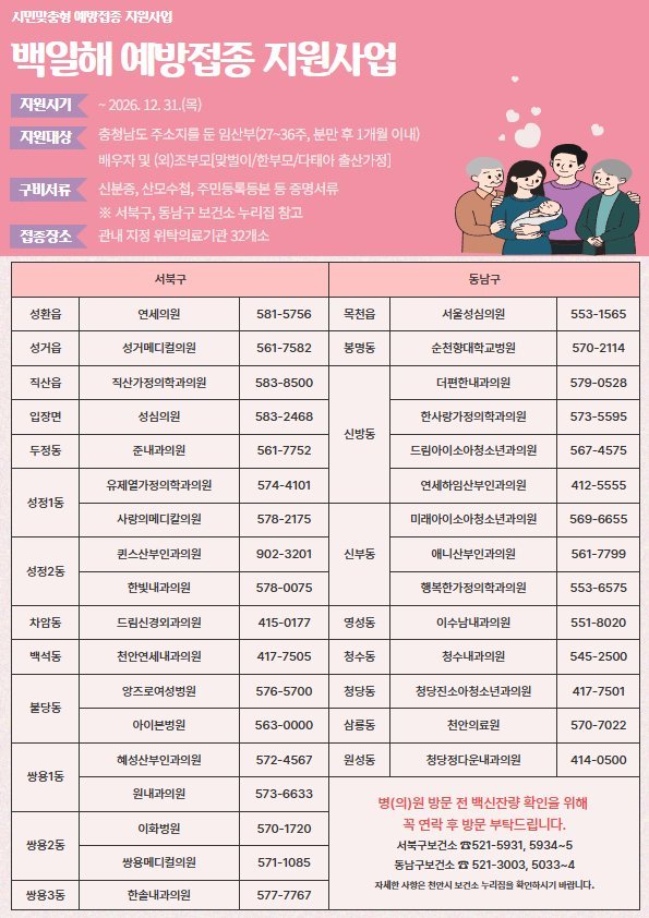 감염병대응센터 백일해예방접종 지원사업 홍보문 천안시 제공