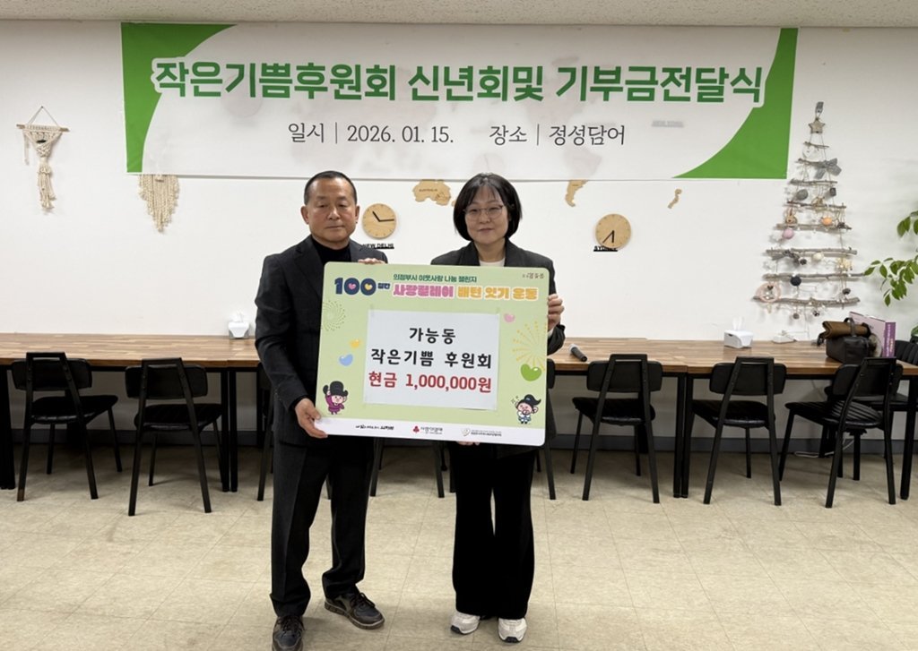 [금요저널] 의정부시 가능동주민센터는 1월 15일 작은기쁨후원회가 ‘100일간 사랑릴레이 배턴 잇기’에 동참하며 성금 100만원을 기탁했다고 밝혔다.