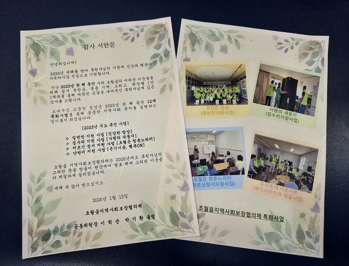 [금요저널] 광주시 초월읍 지역사회보장협의체는 2025년 한 해 동안 지역 내 어려운 이웃을 위해 나눔을 실천한 후원자 145명에게 감사의 마음을 담은 서한문을 발송했다고 19일 밝혔다.