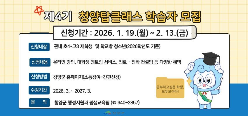 [금요저널] 청양군이 지역 학생들에게 수도권 수준의 고품격 교육 콘텐츠를 제공해 도농간 교육 격차를 줄이고 인재 유출을 막기 위한 ‘제4기 청양 탑클래스 학습지원’사업을 본격 추진한다.