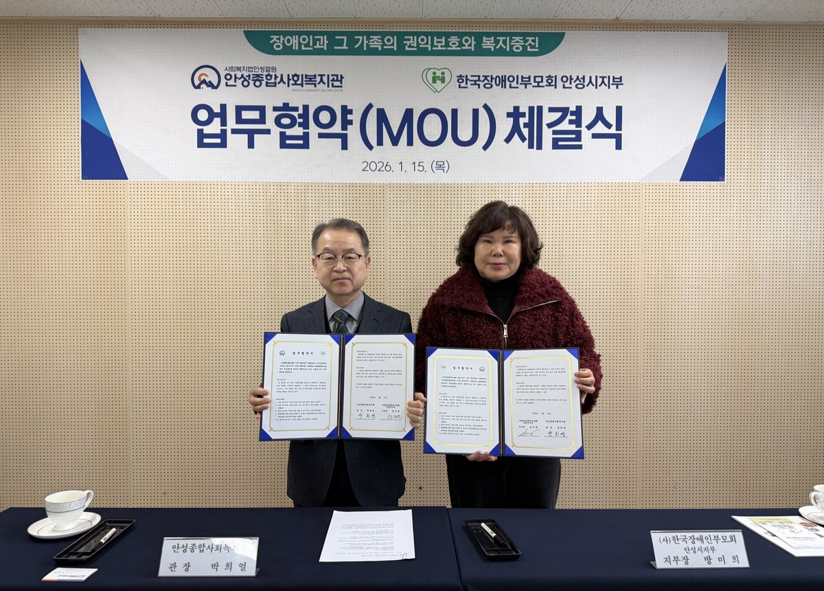 [금요저널] 안성종합사회복지관은 지난 15일 한국장애인부모회 안성시지부와 장애인·가족 권익 보호 및 복지 증진을 위한 업무협약을 체결했다.
