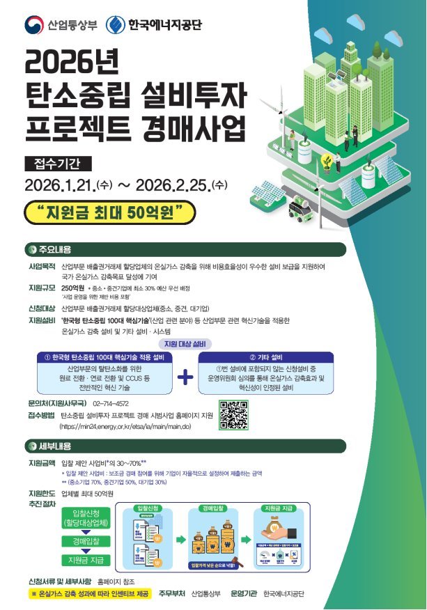 한편 산업부는 경매사업 공모 개시일인 1월 21일, 경매사업을 포함한 주요 4개 탄소중립 지원사업*을 대상으로 ‘2026년도 산업부 탄소중립 지원사업 공동 설명회’도 개최한다. 설명회에서 경매사업의 주요 내용, 입찰 절차, 유의사항 등에 대한 상세 설명과 함께 질의응답을 통해 기업들의 궁금증을 해소하고 보다 많은 기업의 참여를 유도한다는 계획이다.