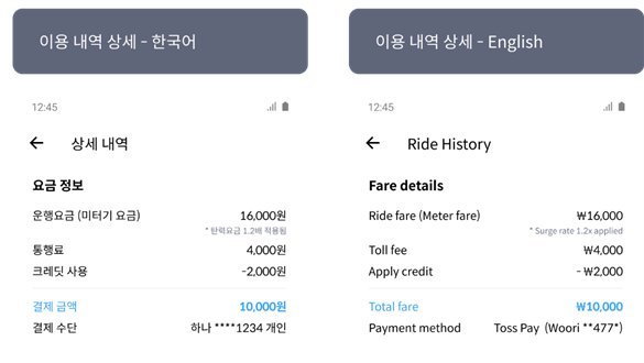 기존의 택시 예상 요금은 ‘운행 요금’만 표시돼 기사가 도로 통행료 등을 부당하게 부과하더라도 승객이 알기 어려웠으나 이제 외국인 전용 앱 호출 시 ‘통행료’ 항목을 표기, 최종 요금에 부과된 통행료와 비교할 수 있게 됐다.