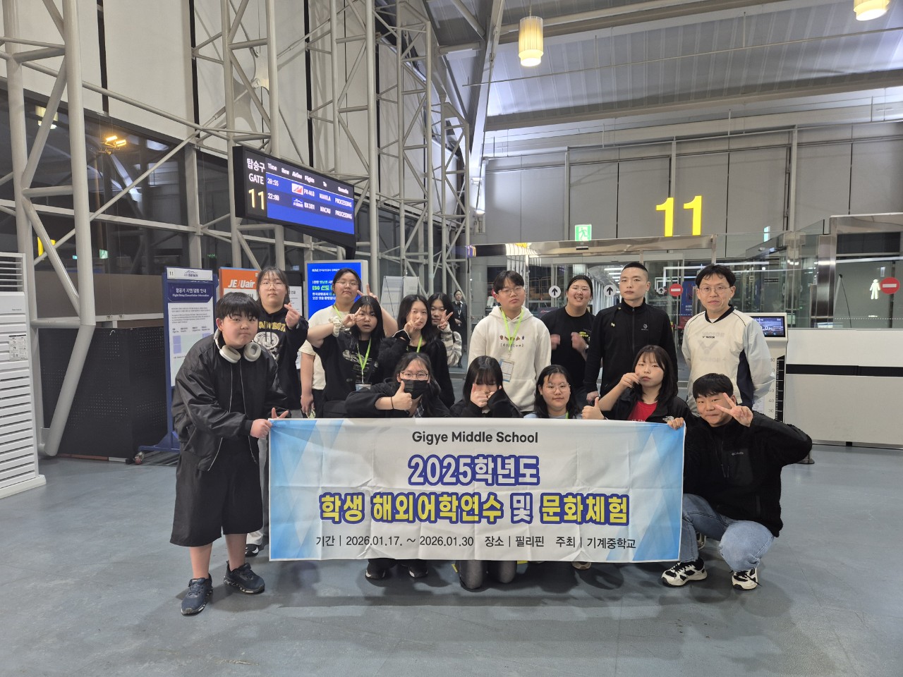 - 기계중학교(전교생 23명, 교장 이동훈)는 2026. 1. 17.(토) ~ 1. 30.(금)까지 13박 14일 일정으로 1,2학년중 희망학생 13명을 대상으로(분교포함) 필리핀 마닐라 현지의 해외 어학연수를 추진하였다.