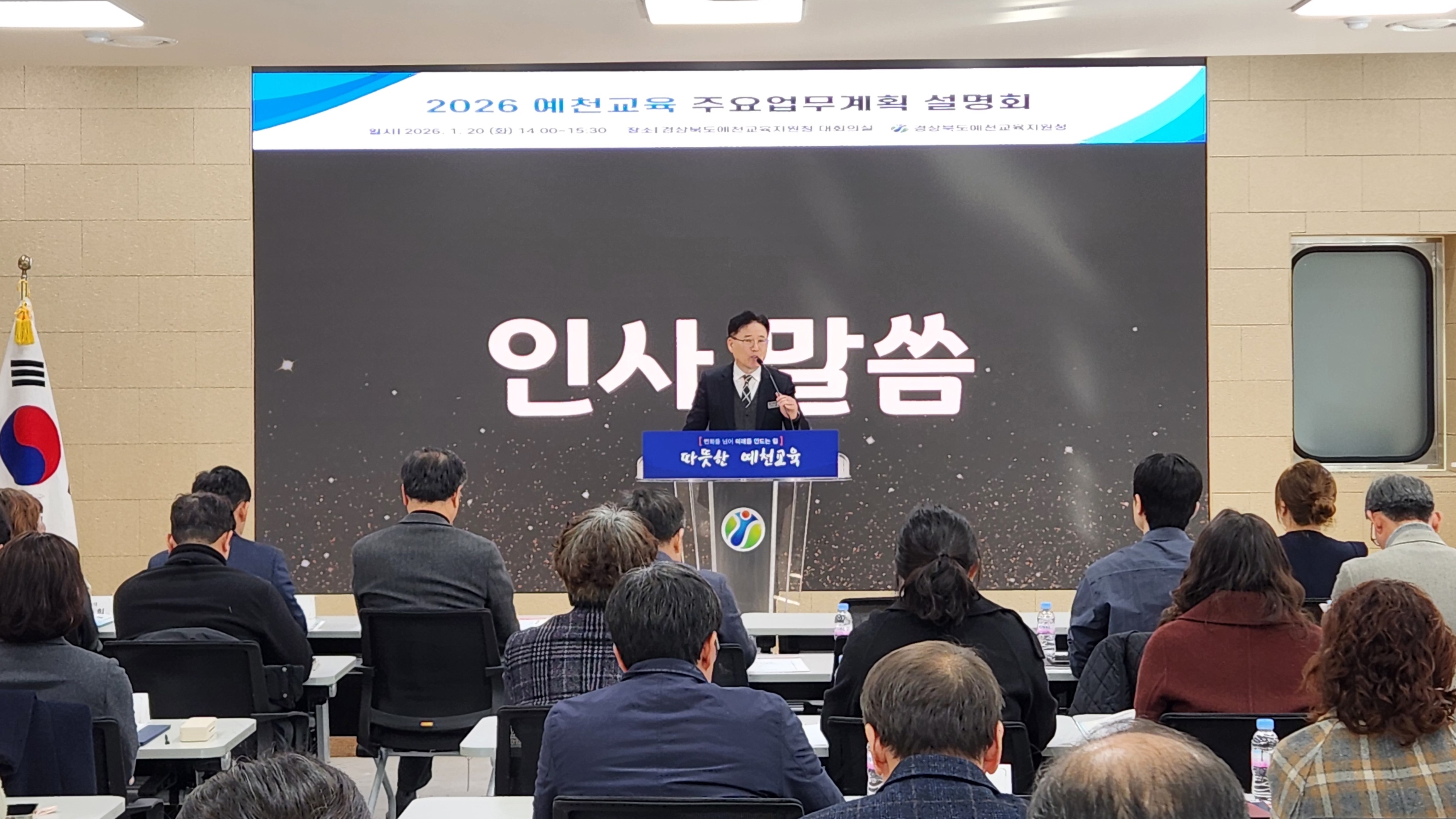 경상북도예천교육지원청(교육장 김성중)은 1월 20일(화) 경상북도예천교육지원청 대회의실에서 관내 유‧초‧중‧고 관리자 및 학부모 등 교육 관계자 60여 명이 참석한 가운데, 2026 예천교육 주요업무계획 설명회를 개최했다.