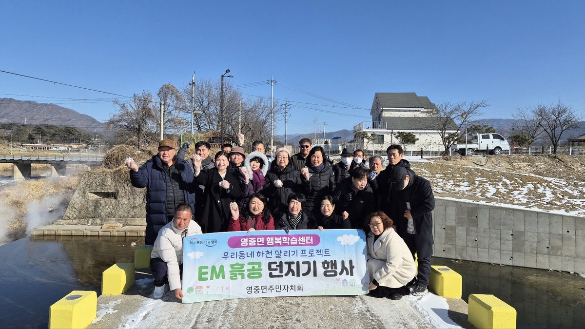[금요저널] 영중면 주민자치회는 지난 1월 20일 영중면 포천천·영평천 합수지점 일원에서 하천 수질 개선과 생태환경 복원을 위한 ‘EM 흙공 던지기 행사’를 진행했다고 밝혔다.