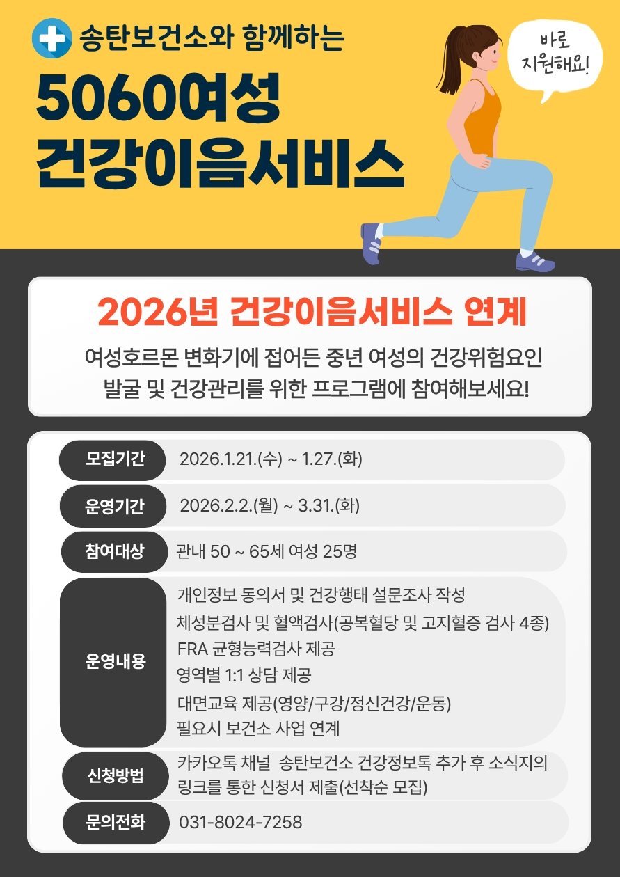 송탄보건소 ‘5060여성 건강이음서비스’사업의 내용 및 신청은 카카오톡 채널 ‘송탄보건소 건강정보톡’을 통해 알 수 있으며