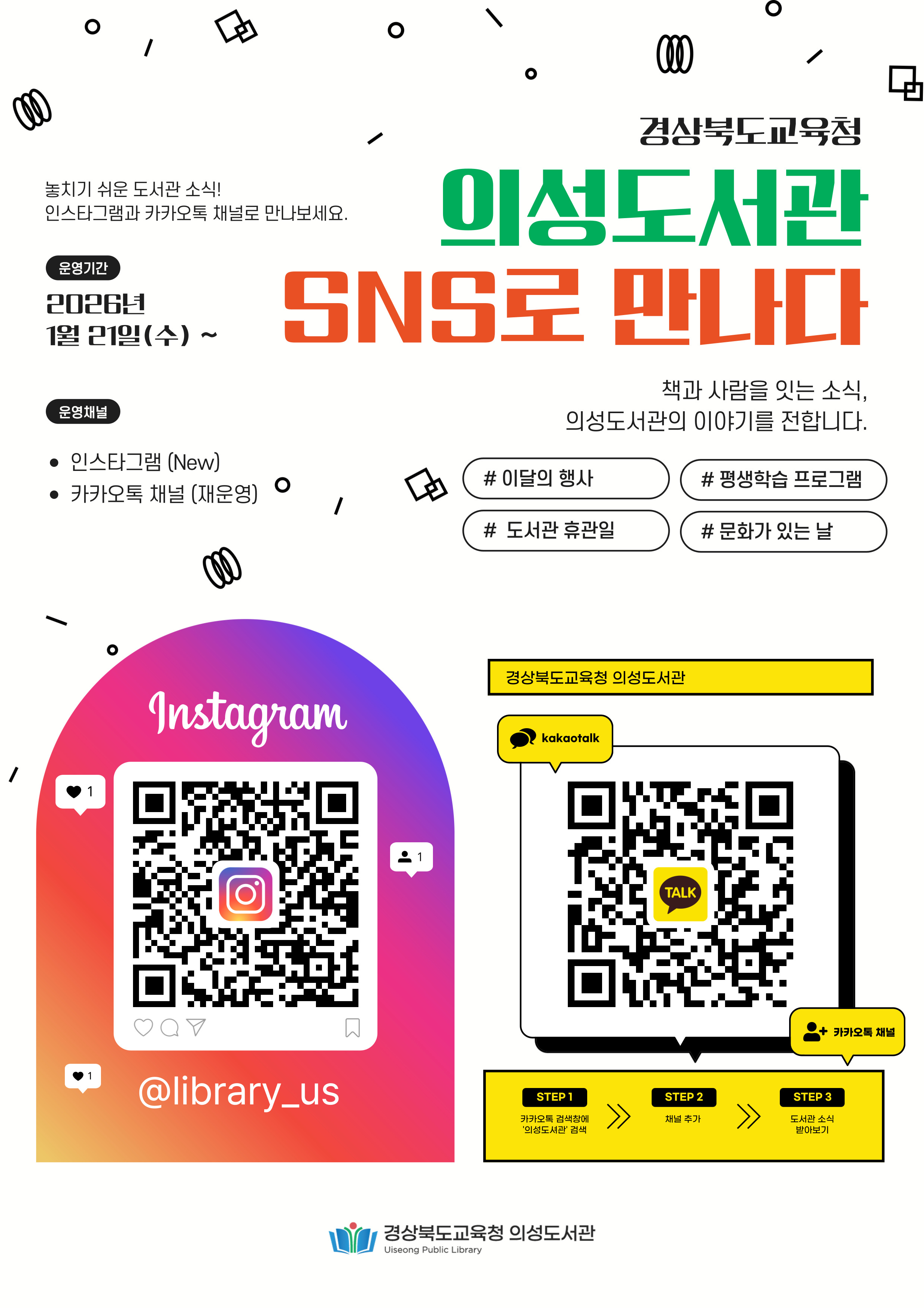 □ 경상북도교육청 의성도서관(관장 이미경)은 이용자와의 소통을 강화하고 도서관 소식을 신속하게 전달하기 위해 인스타그램과 카카오톡 채널을 운영한다고 1월 21일(수) 밝혔다.
