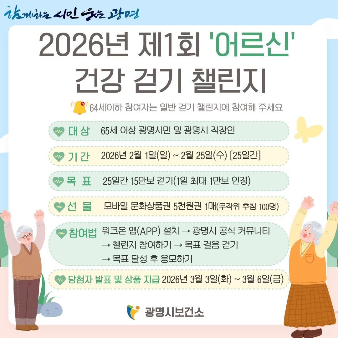 [금요저널] 광명시가 오는 2월부터 모바일 걷기 플랫폼 ‘워크온’을 활용한 걷기 챌린지 방식을 개편하고 65세 이상 시민을 위한 ‘어르신 걷기 챌린지’를 별도로 운영한다고 21일 밝혔다.