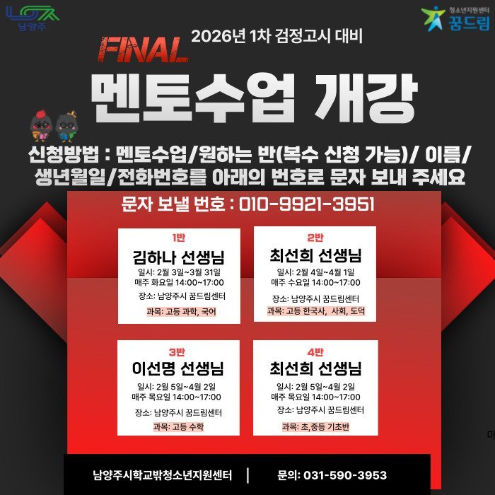 [금요저널] 남양주시는 오는 2월 3일부터 남양주시학교밖청소년지원센터에서 학업을 중단한 청소년을 대상으로 ‘2026년도 제1회 검정고시 대비 학습 멘토링 프로그램’을 운영한다고 밝혔다.