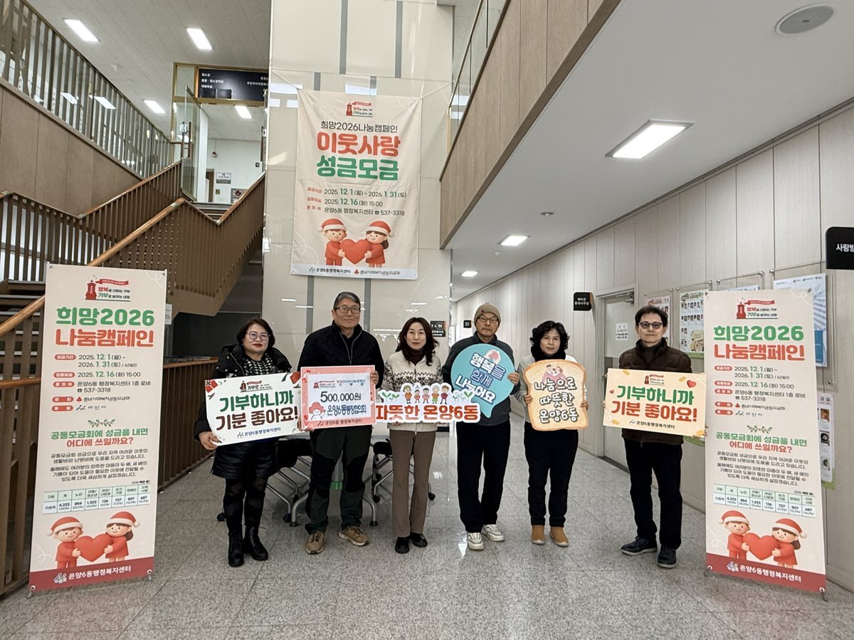 '희망2026 나눔캠페인'은 "행복을 더하는 기부, 기부로 바꾸는 아산"이라는 슬로건으로 2026년 1월 31일까지 진행되며 성금 모금 참여는 온양6동행정복지센터 복지행정팀을 통해 가능하다.