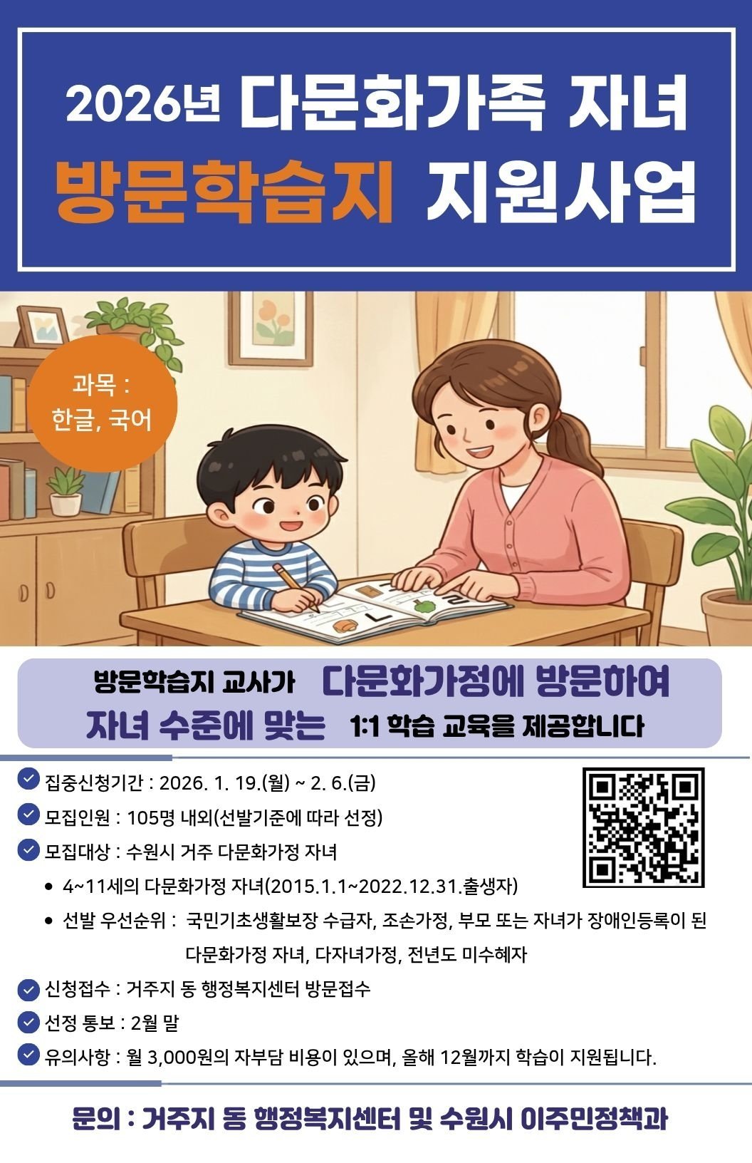 [금요저널] 수원특례시가 다문화가족 자녀에게 한글·국어 방문학습을 지원하는 ‘2026 다문화가족 자녀 방문학습지 지원 사업’참여자를 2월 6일까지 모집한다.