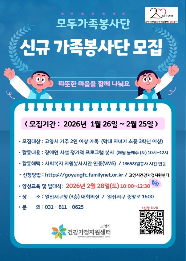 [금요저널] 고양특례시 건강가정지원센터에서는 오는 2월 25일까지 2026년 ‘가족봉사단’참여자를 모집한다.