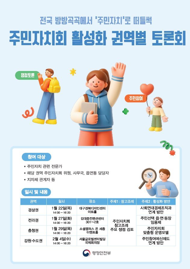 [금요저널] 행정안전부는 주민자치회 활성화를 위해 현장의 목소리를 직접 듣고 이를 정책에 반영하고자 경상권, 전라권, 충청권, 강원·수도권 4개 권역에서 순회 토론회를 진행한다고 밝혔다.