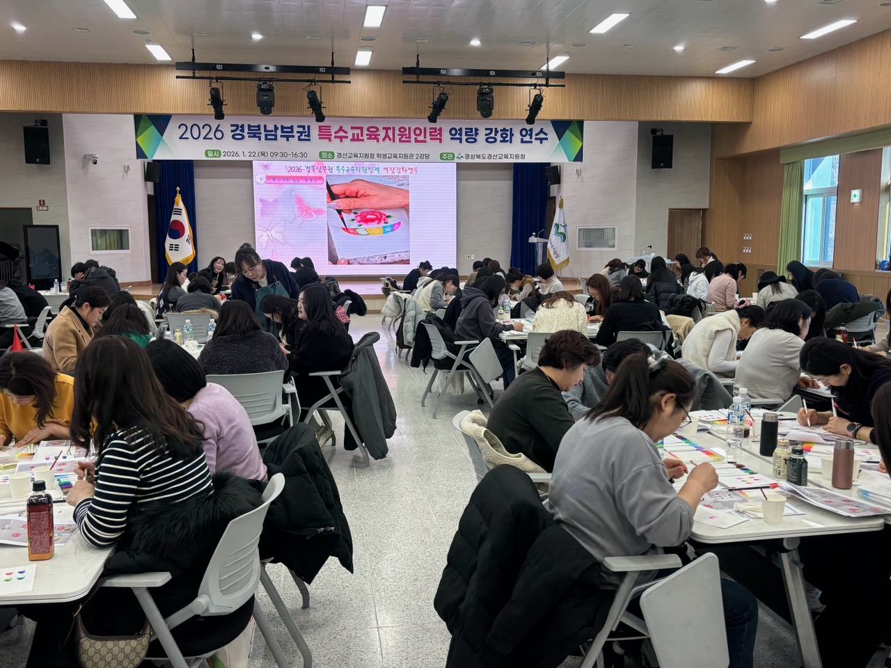 □ 경산교육지원청(교육장 정수권) 특수교육지원센터는 1월 22일(목) 학생교육지원관 2강당에서 경북 남부권(경산, 영천, 청도, 경주) 유, 초, 중, 고등학교, 특수학교 특수교육실무사 및 사회복무요원 150여 명을 대상으로 역량 강화 연수를 실시하였다.
