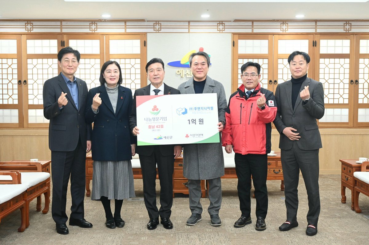 예산군수는 “㈜후엔지니어링이 나눔명문기업에 가입하며 지역사회 나눔 문화 확산에 앞장서 주셔서 감사하다”며 “지역 기업이 솔선수범해 보여주는 나눔 실천이 지역사회를 더욱 따뜻하게 만드는 밑거름이 될 것”이라고 말했다.