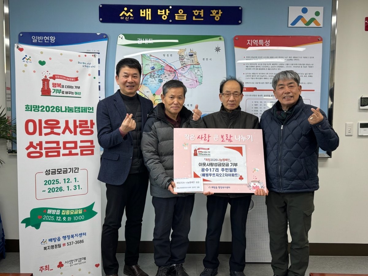 배방읍 공수17리 배방푸르지오2차아파트 주민들은 지난 21일 배방읍 행정복지센터를 방문해 어려운 이웃을 돕기 위한 희망2026 나눔캠페인 성금 50만원을 기탁했다.