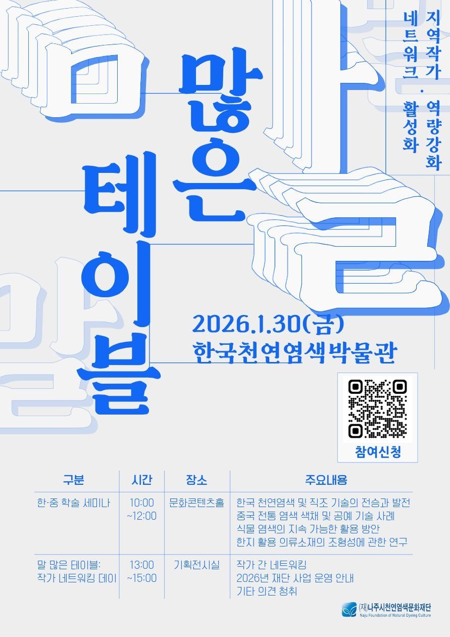 재단은 오는 1월 30일 한국천연염색박물관에서 지역 작가의 전문성 강화와 창작 교류 활성화를 위한 역량 강화 네트워킹 행사 '말 많은 테이블'을 개최한다고 23일 밝혔다.