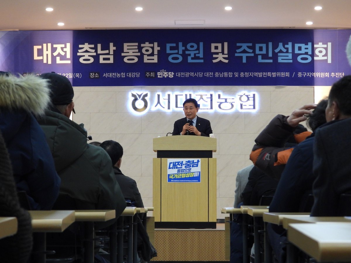 [금요저널] 더불어민주당 대전·충남통합 및 충청지역발전특별위원회 대전 중구 추진단이 대전·충남통합을 주제로 22일 주민설명회를 개최했다.
