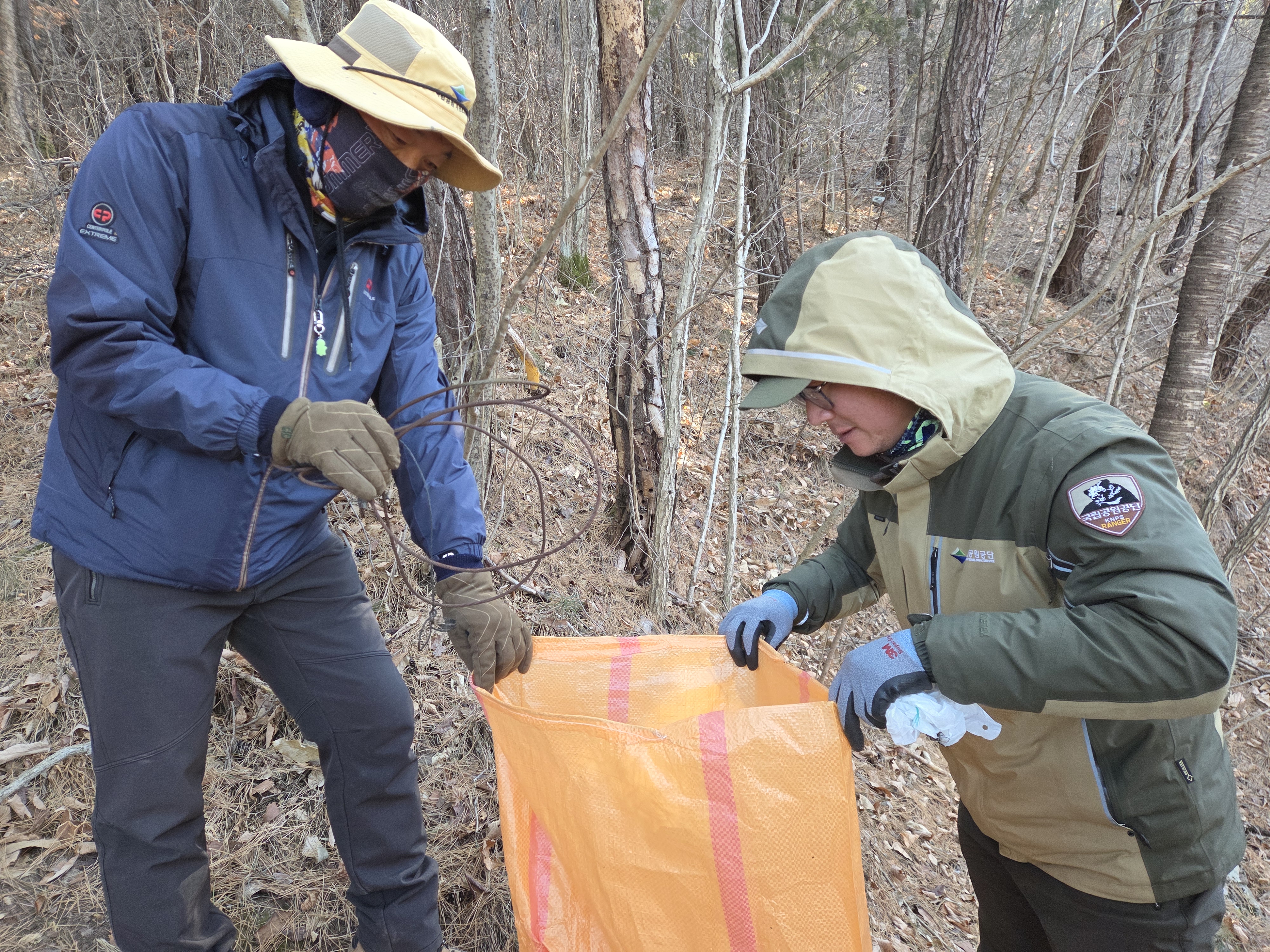 이날 행사에는 대구지방환경청, 청송군, 포스코 자원봉사자 등 45명이 참여하였으며, 올무 3점을 비롯한 쓰레기 20kg을 수거했다.