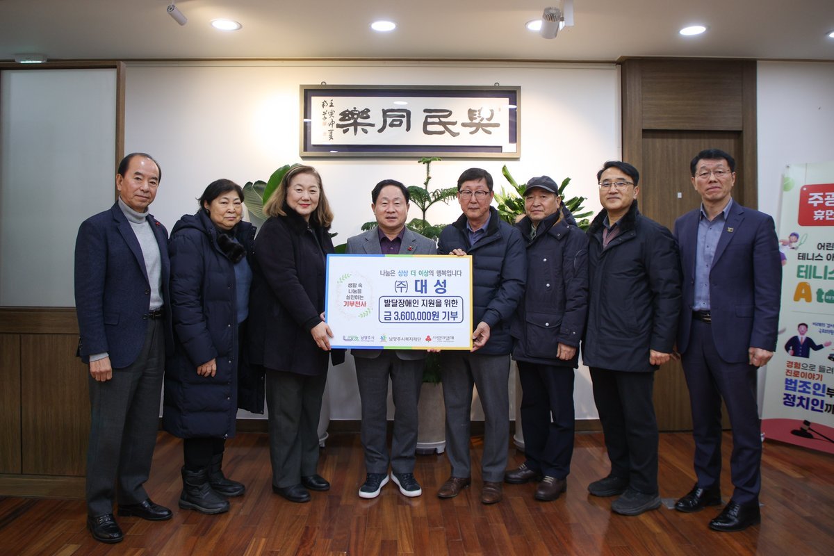 [금요저널] 남양주시는 관내 전기·금속 소재 재료 제조업체 ㈜대성이 발달장애인을 위한 나눔을 4년째 이어오며 올해도 후원금 360만원을 기탁했다고 23일 밝혔다.