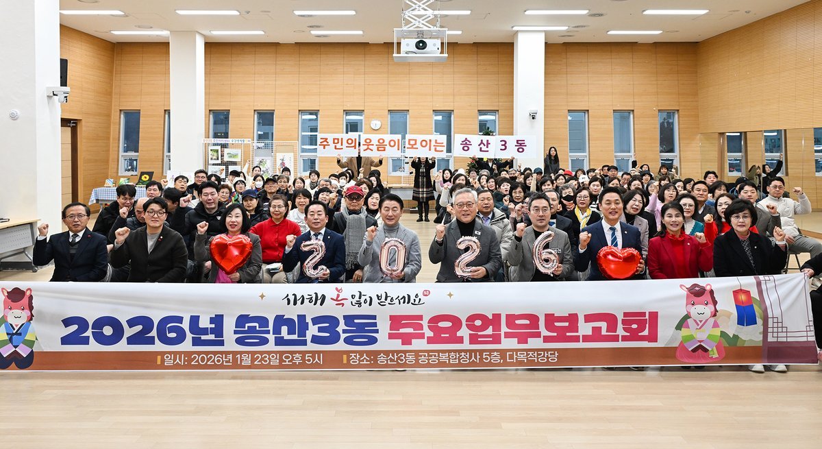 [금요저널] 의정부시 송산3동행정복지센터는 1월 23일 지역 주민과 내빈 등 100여명이 참석한 가운데 ‘성장의 결실과 함께, 더 큰 미래로’를 주제로 ‘2026년 송산3동 주요업무보고회’를 개최했다.