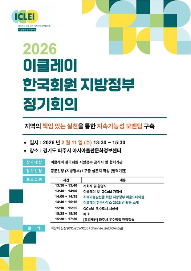 2026년 정기회의에서는 ‘지역의 책임 있는 실천을 통한 지속가능성 전환 국면 구축’이라는 주제로, △한국집행위원회 회의 △신규회원 인증서 전달식 △지자체 정책 원탁회의 △이클레이 활동과 협업 우수사례 공유 △글로벌 기후에너지 시장협약 신규인증서 전달식 등이 진행된다. 이와 함께 실무 공직자 등을 대상으로 한 오두산통일전망대, 임진각 곤돌라 탑승 등 파주시 우수 정책 현장학습도 운영될 예정이다.
