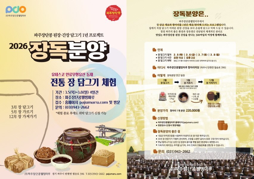 최만영 ㈜파주장단콩웰빙마루 대표이사는 “한국의 장 담그기 문화가 2024년 유네스코 인류무형문화유산으로 등재되면서 장독분양 행사가 더욱 뜻깊은 의미를 갖게 됐다”라며 “전통 식문화를 직접 체험하며 소중한 추억을 쌓는 동시에 웰빙마루 또한 함께 성장할 수 있는 계기가 되길 바란다”라고 말했다.