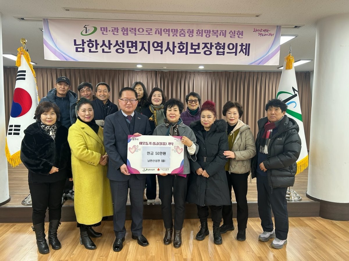 이번 성금은 남한산성면이 복지 사각지대 해소와 나눔 문화 확산을 위해 주민 중심의 맞춤형 복지서비스를 적극 추진한 성과로 받은 포상금으로 기탁된 성금은 지역 내 취약계층 지원을 위해 사용될 예정이다.