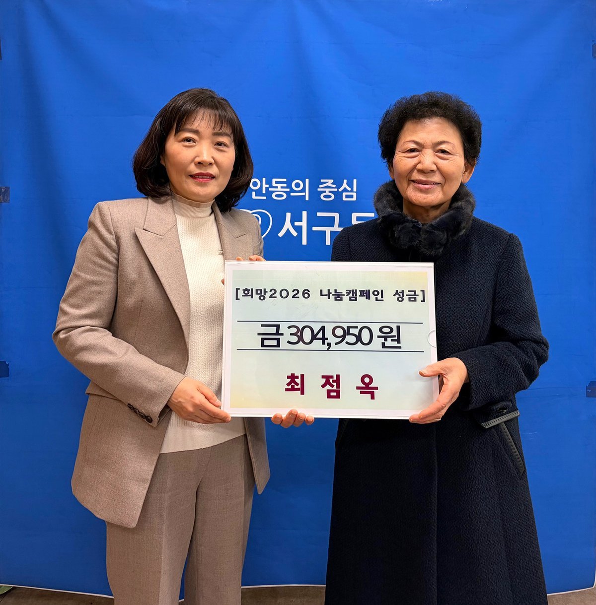 [금요저널] 안동시 서구동에 거주하는 최점옥 어르신은 어려운 이웃과 함께 나누고자 1월 26일 서구동행정복지센터를 방문해 3000여 개의 빈 병을 수거해 모은 성금 30만4950원을 희망2026 나눔캠페인 성금으로 기탁했다.