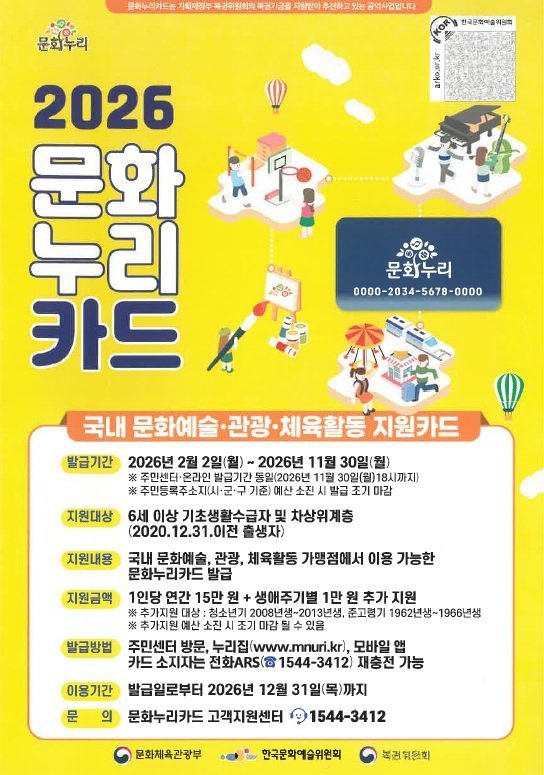 특히 청소년기와 준고령기 대상자는 연간 16만 원까지 지원받을 수 있다. 신청은 2월 2일부터 읍면동 행정복지센터 방문 또는 문화누리 누리집을 통해 가능하다.